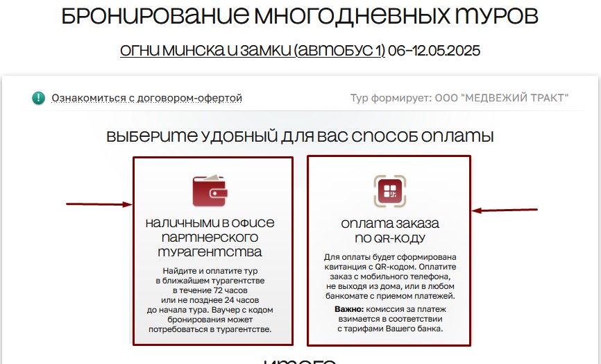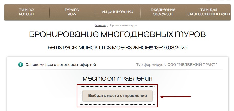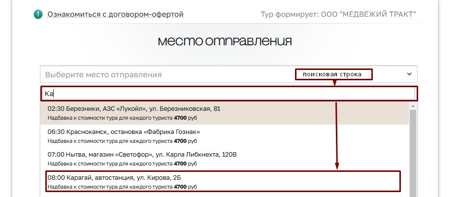Договор-оферта доступен для ознакомления на странице описания программы тура. Договор можно получить в автобусе при посадке.