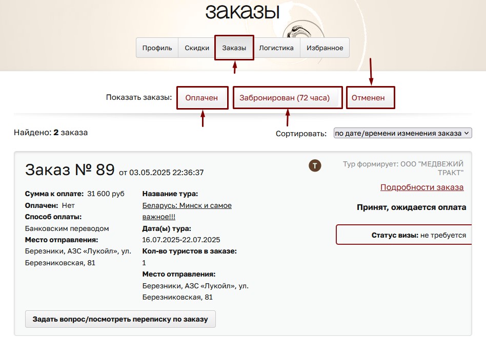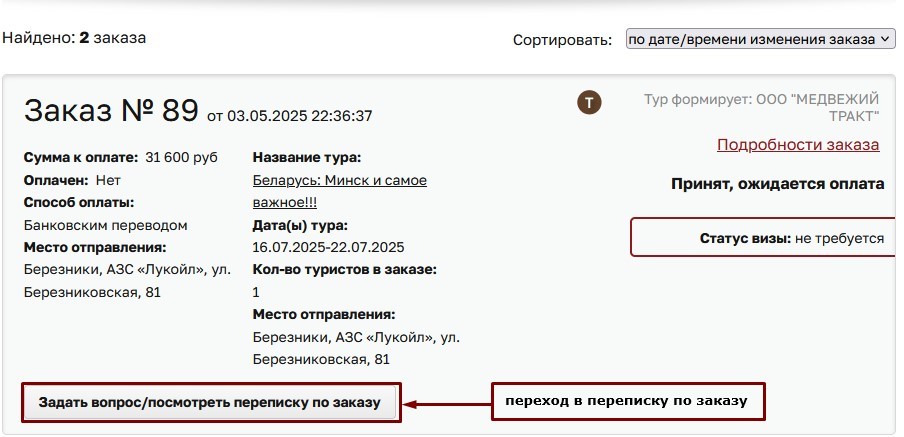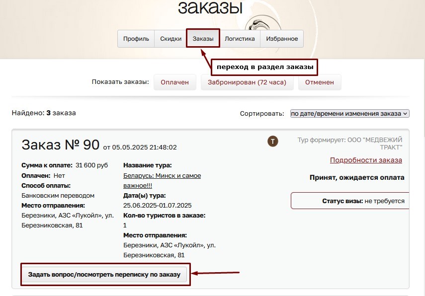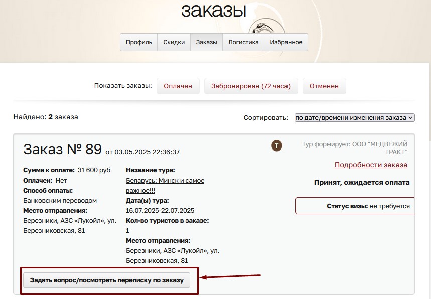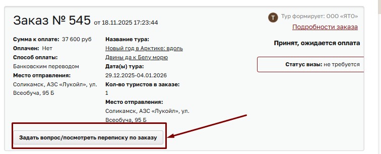 В случае возникновения дополнительных вопросов, необходимости внесения изменений в заказ, подтверждения льготного положения туриста и прочих ситуациях просим Вас воспользоваться функцией (кнопкой) «Задать вопрос / посмотреть переписку по заказу». Для этого необходимо: