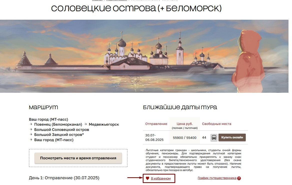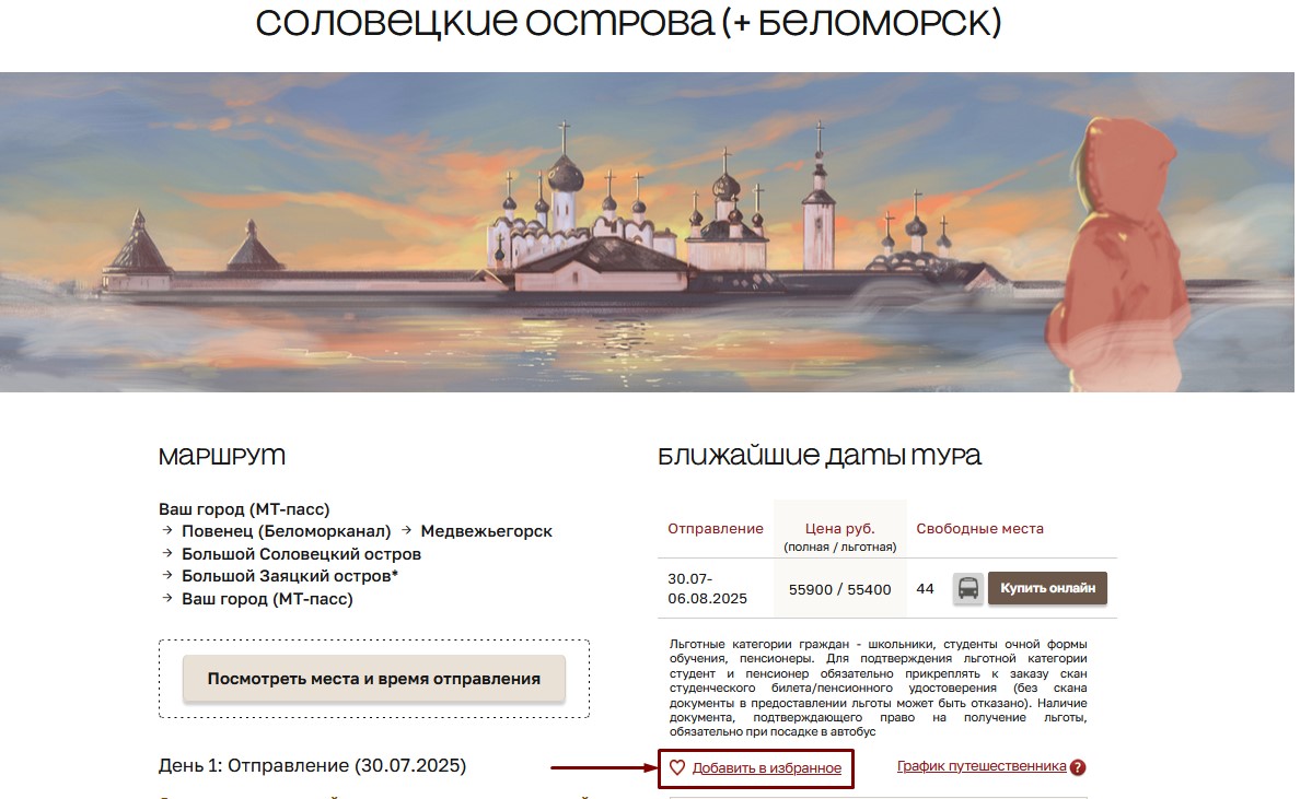 Чтобы добавить понравившийся Вам тур в раздел «Избранное» необходимо перейти на его детальную страницу и нажать на кнопку «Добавить в избранное»: