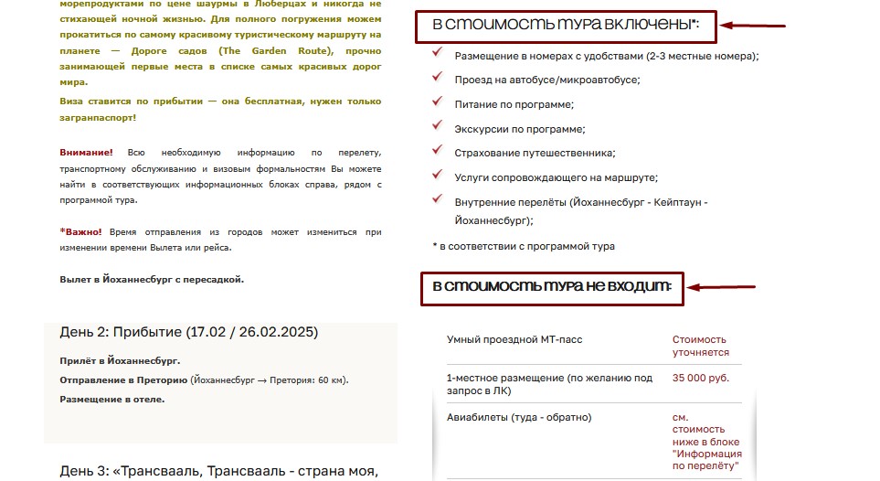 - Информационный блок «В стоимость тура включены», отражающий перечень услуг, входящих в базовую стоимость тура расположен справа, ниже перечня ближайших дат тура.