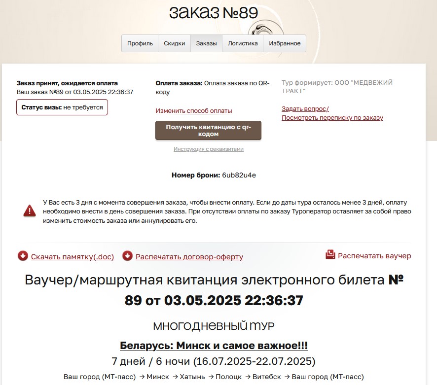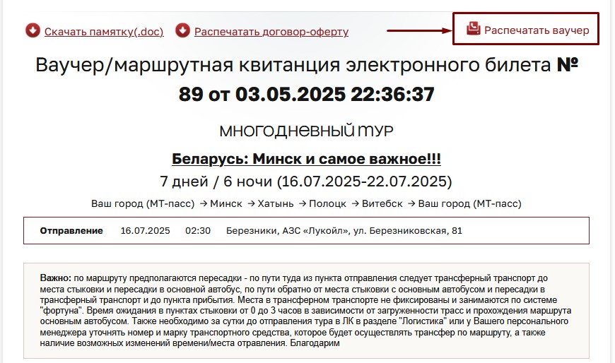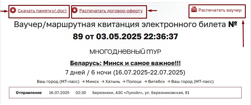 На странице заказа (Личный Кабинет → раздел "Заказы" → "Подробности заказа") Вам необходимо ознакомиться с Памяткой туристу, отправляющемуся в поездку, а также скачать Ваучер – документ, необходимый для посадки в автобус, отражающий факт произведения бронирования и оплаты заказа. Здесь же имеется ссылка на скачивание и распечатку договора-оферты.