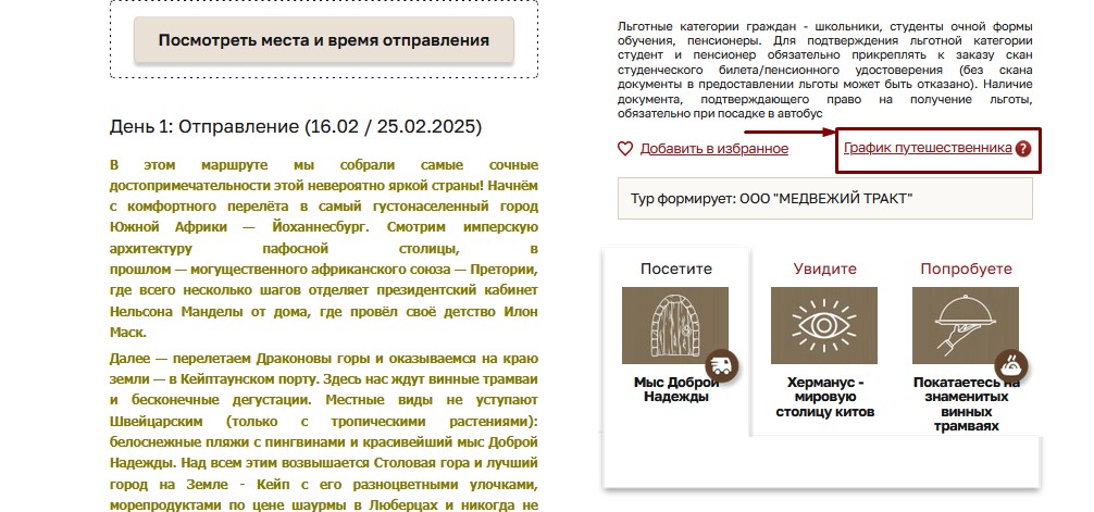 - раздел "График Путешественника" позволяет найти необходимые туры по заданным параметрам (даты, цена, тип транспорта, визовый / безвизовый и прочее).