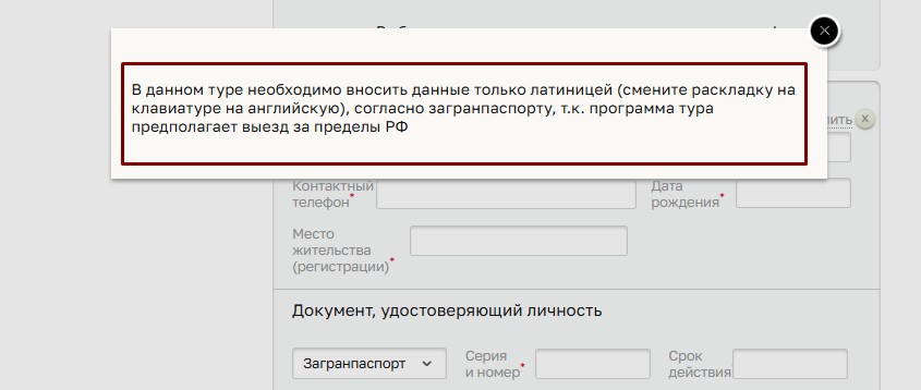 ВАЖНО: при бронировании зарубежных туров в страны, въезд в которые осуществляется по загранпаспорту, паспортные данные заполняются латиницей и в соответствии с загранпаспортом.