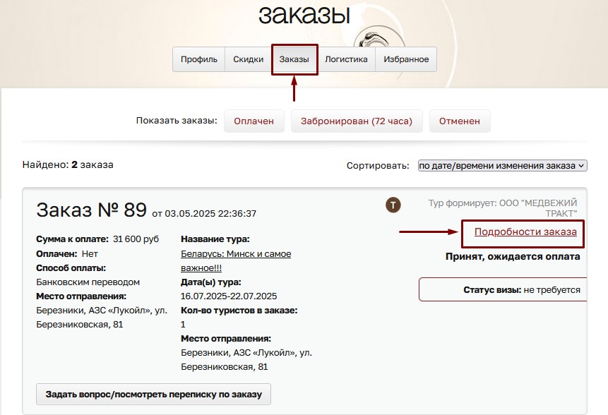 - «Отменен» - в данном подразделе отражены заказы, оплата по которым не поступила в течении 72 часов с момента бронирования, а также заказы, которые были отменены по Вашей инициативе или при отмене тура.