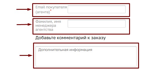 7. Заполнить поле Email покупателя (агента), указав электронную почту, куда придет подтверждение бронирования, а также добавить комментарий по заказу (при наличии);