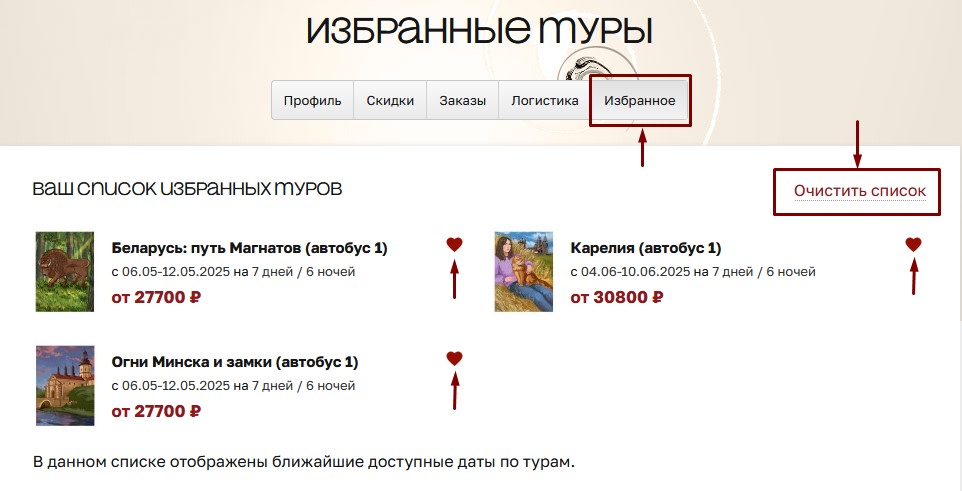5. В разделе «Избранное» отображаются понравившиеся и отмеченные Вами туры. Чтобы убрать тур из данного раздела, нужно кликнуть на значок «сердечко», как это показано на фото ниже. Чтобы полностью очистить раздел, необходимо нажать на кнопку «Очистить список».