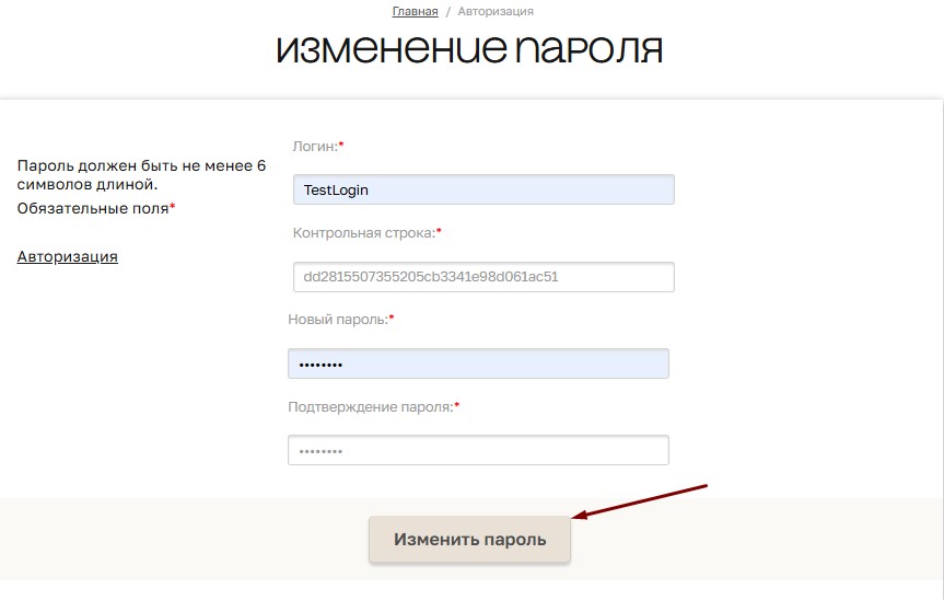 3. Ссылка переведет на страницу "Изменение пароля". Введите новый (придуманный Вами) пароль дважды. Будьте внимательны. Далее нажмите кнопку "Изменить пароль".