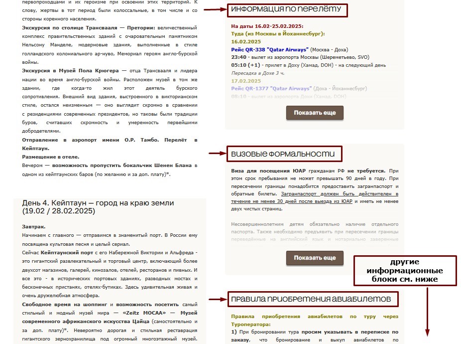 - Справа от описания программы (под информацией о размещении) расположены блоки с важной организационной и практической информацией по туру: документы, необходимые для совершения поездки по зарубежным турам, визовые формальности, правила въезда/выезда несовершенных лиц, информация о повышающем коэффициенте в случае отправления в тур туристов из отдаленных городов, правила приобретения авиабилетов по туру и т.д.