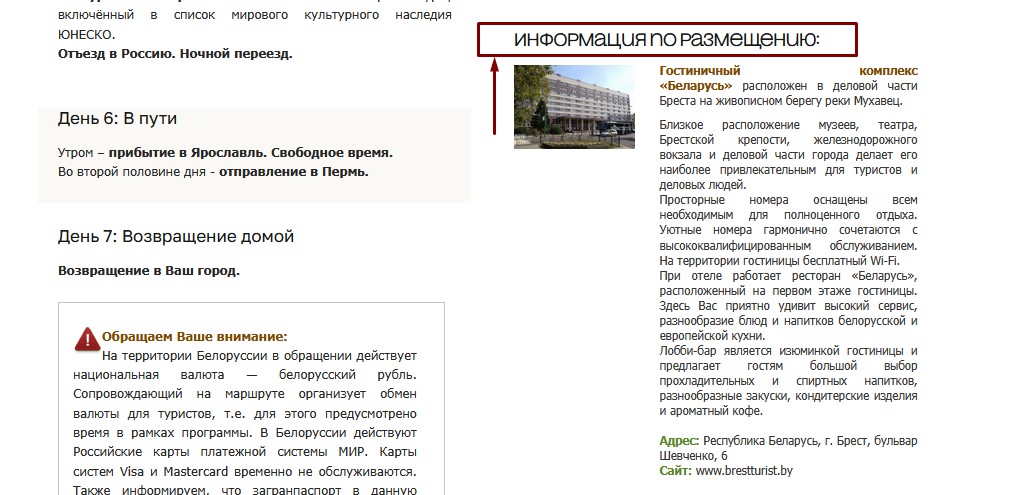 - Информация по размещению - краткое описание средства размещения расположено справа, ниже раздела «В стоимость тура не входит».
