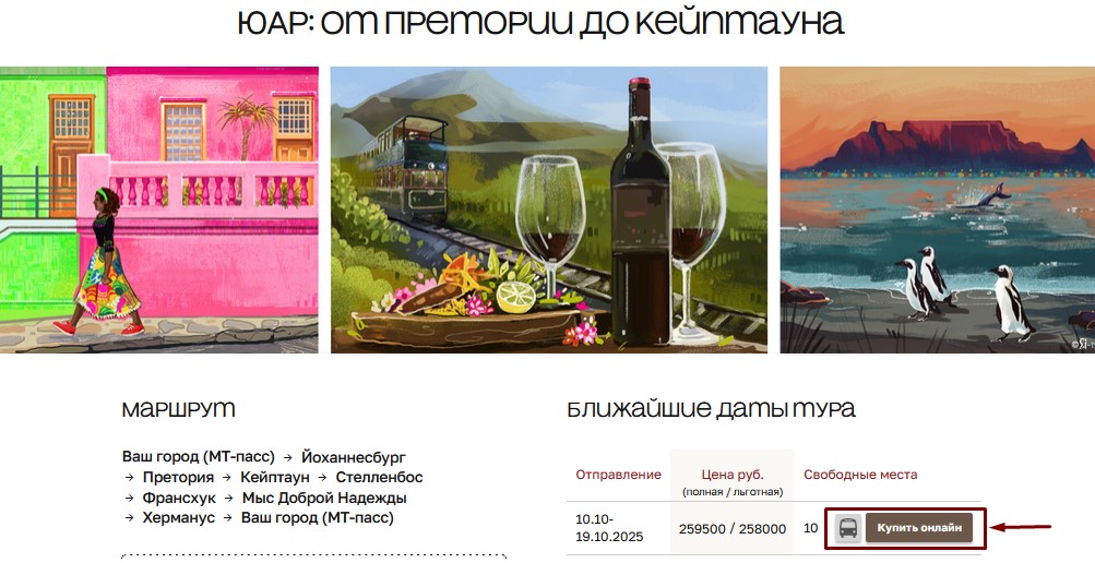 3. После ознакомления с программой и выбора наиболее удобной для Вас даты отправления по туру из предложенных можно приступить к бронированию тура, нажав на кнопку "Купить онлайн" (напротив выбранной даты).