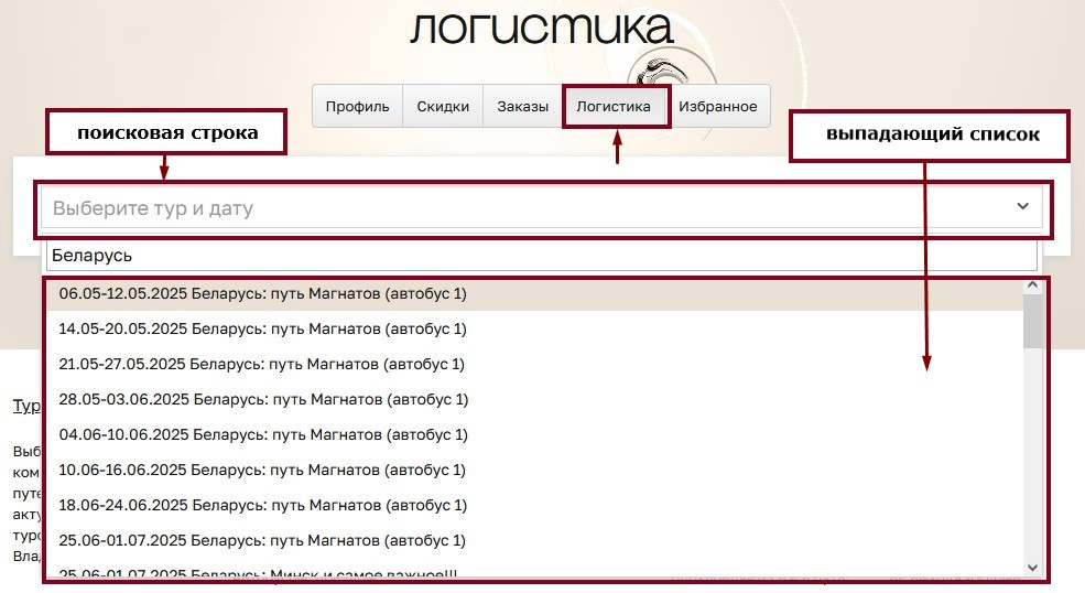 4. С помощью раздела «Логистика» Вы можете отслеживать всю информацию по отправлению на маршруты. Для удобства и скорости нахождения необходимой информации используйте поисковую строку (введите название тура), а далее выберите нужный тур из выпадающего списка.