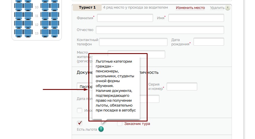 - Если турист претендует на льготу (школьники, студенты очной формы обучения, пенсионеры) - необходимо указать на данный факт для корректного бронирования (поставить галочку в поле "есть льгота").