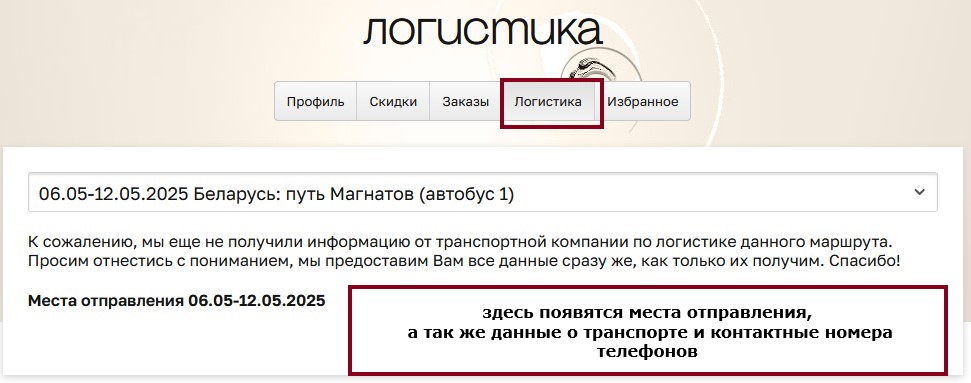 Информация по отправлению доступна в разделе «Логистика» в Вашем Личном Кабинете. ВАЖНО: индивидуальная рассылка не производится - с информацией необходимо ознакомиться самостоятельно!