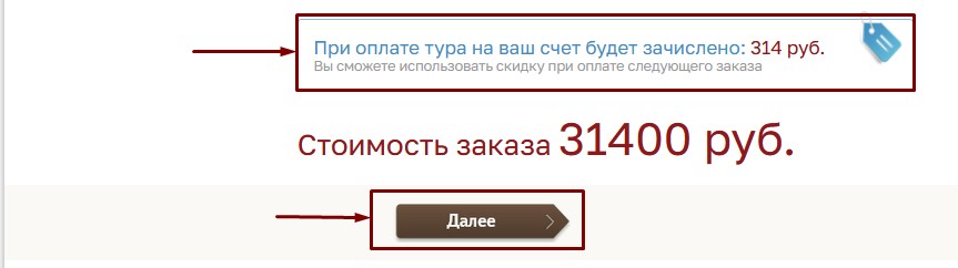8. После заполнения всех необходимых данных нажать кнопку "Далее" - произойдет переход на страницу оплаты. Обратите внимание, после оплаты и реализации тура на Ваш бонусный счет будут начислены бонусы. Их можно использовать для частичной оплаты тура при последующих бронированиях (подробнее в разделе "Бонусная программа: что это?".