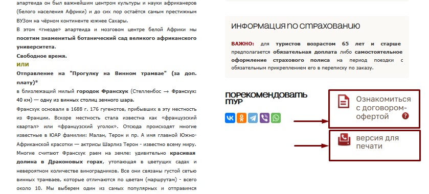 - Справа, ниже всех информационных блоков расположен договор с физическим лицом, который можно открыть в новой вкладке, а далее скачать, нажав на кнопку «Ознакомиться с договором». Рекомендуем ознакомиться с ним. Здесь же можно скачать, а после распечатать описание программы и прочих деталей тура, кликнув на кнопку «Версия для печати».