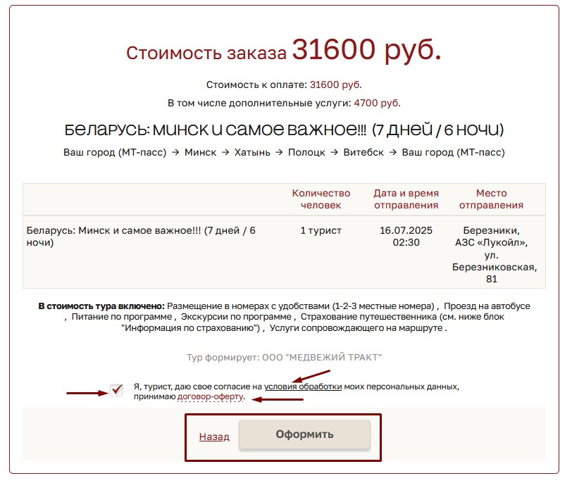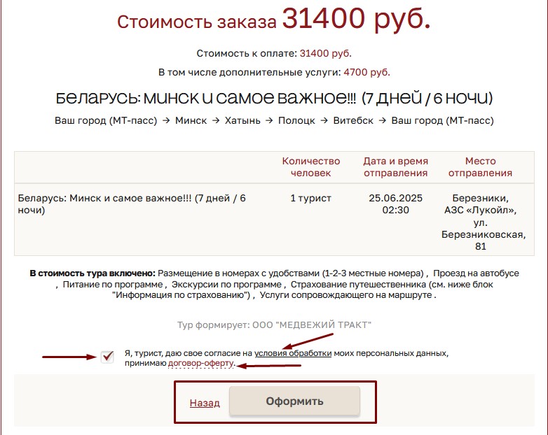 На этапе бронирования тура Вам необходимо ознакомиться с договором-офертой, подтвердить свое согласие на обработку персональных данных, подтвердить факт ознакомления с данными документами.