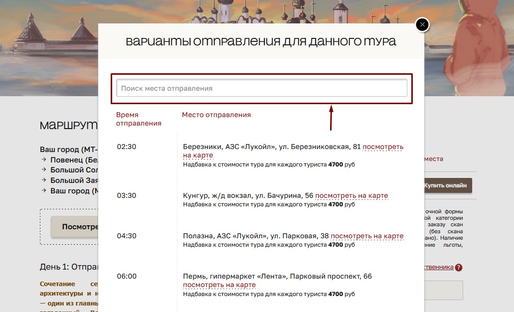 - Просмотр мест отправления доступен после нажатия кнопки «Посмотреть места и время отправления», расположенной сверху, над описанием тура. Все точки будут представлены в виде выпадающего списка. Для простоты поиска информации рекомендуем воспользоваться поисковой строкой;