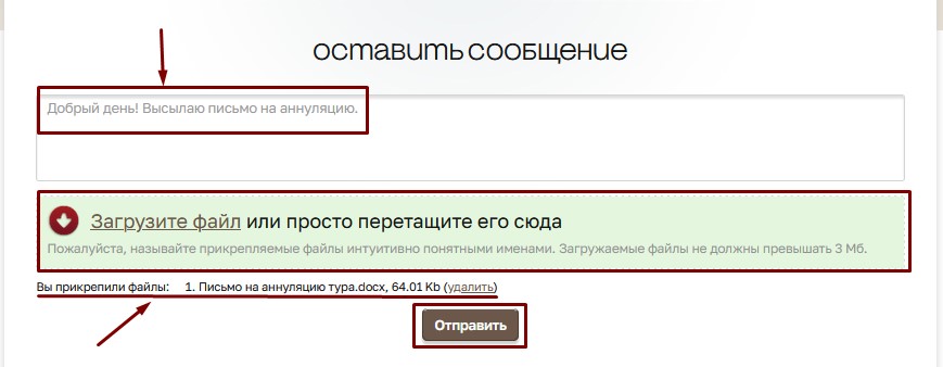 4. Заполненное заявление об аннуляции заказа вновь прикрепляется в переписку по заказу. Обратите внимание: для прикрепления и отправки любого файла требуется прописать сопроводительное текстовое сообщение (без текста документ не отправится).