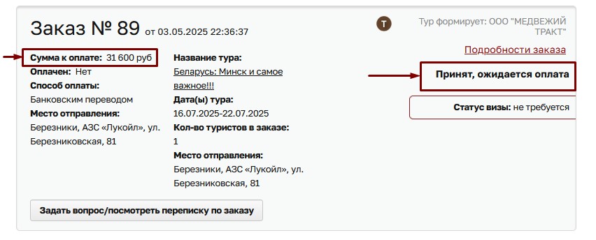 В случае возникновения дополнительных вопросов, для бронирования одноместного размещения, подтверждения льготного положения туриста, редактирования заказа и т.д., просим воспользоваться функцией (кнопкой) «Задать вопрос / посмотреть переписку по заказу».