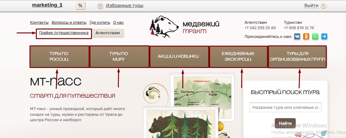 - в разделе "Акции и новинки" представлены действующие акционные предложения, а также туры-новинки;