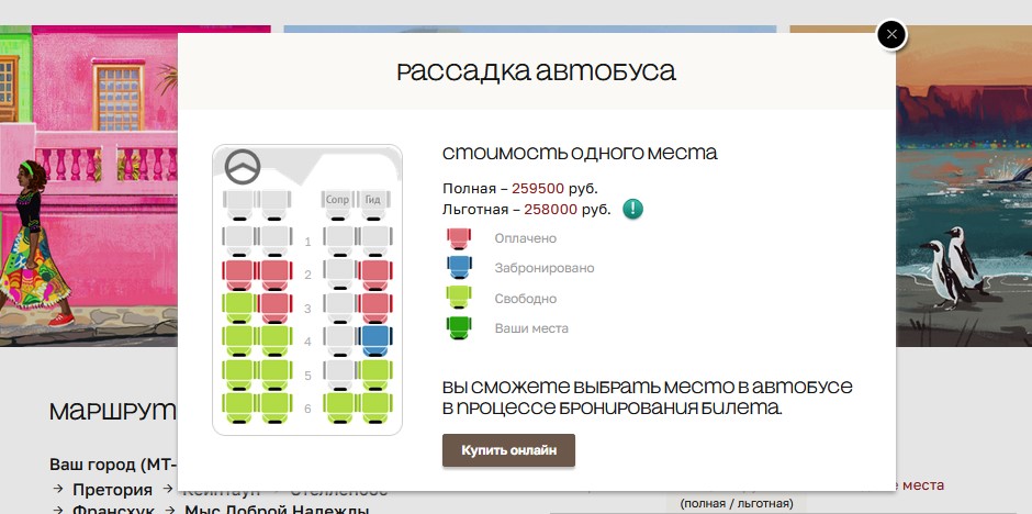 5. Выбрать место в автобусе: светло-зеленые места - свободные, синие и красные - забронированы, темно-зеленым цветом отмечаются выбранные вами места. Вы можете выбрать сразу несколько мест и забронировать несколько туристов в одном заказе.