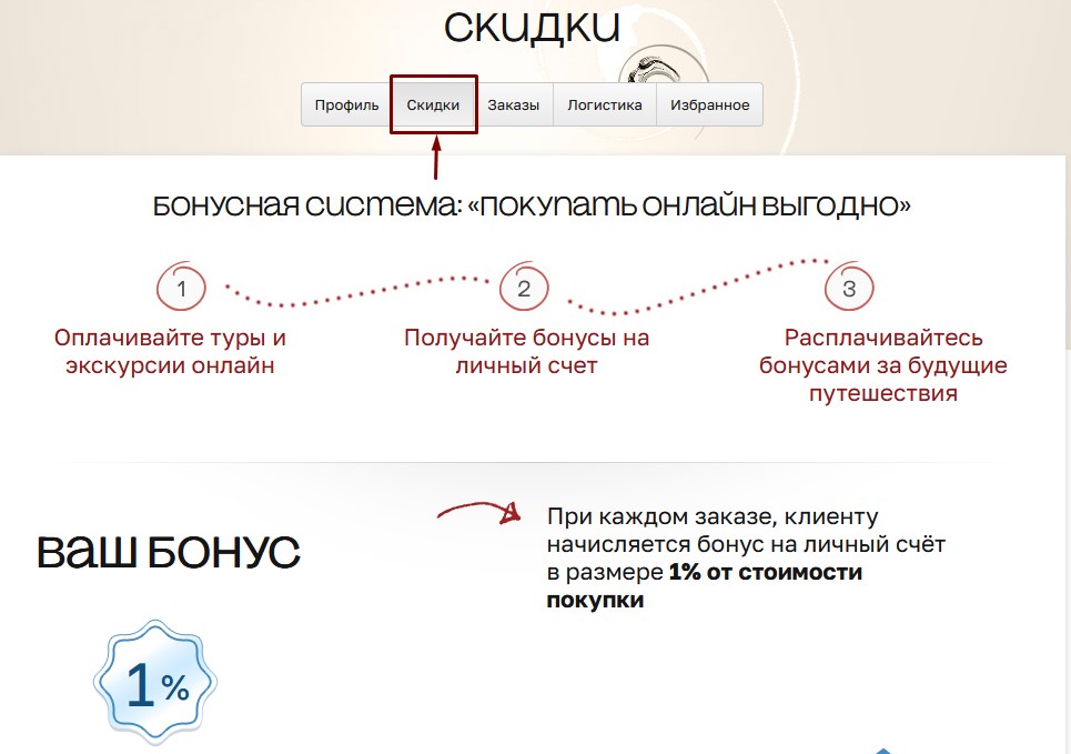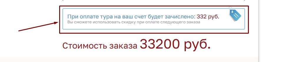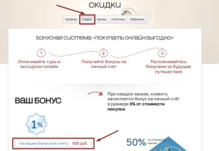 Общее количество начисленных бонусов (после совершения оплаты и поездки (поездок) в тур) Вы можете также увидеть в Вашем личном кабинете в разделе «Скидки» или в верхней строке сайта рядом с активной ссылкой на переход в Личный Кабинет.