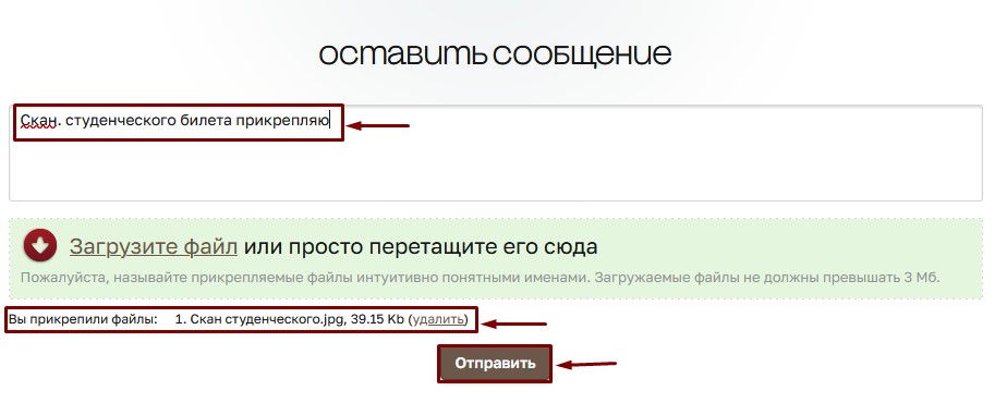 Обратите внимание: для прикрепления и отправки любого файла требуется прописать сопроводительное текстовое сообщение (без текста документ не отправится) - необходимо ввести хотя бы 1 символ.