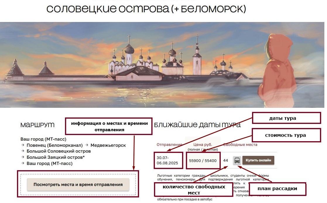 - Даты тура, стоимость тура, количество свободных мест обозначены справа от описания программы: